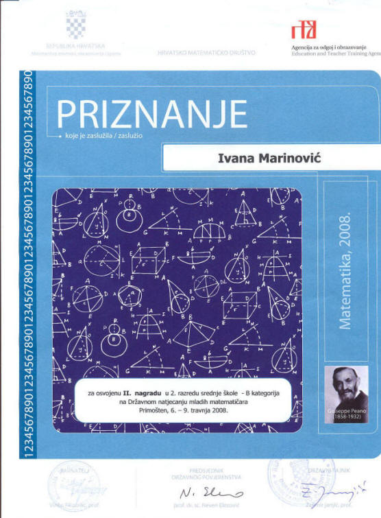 Ivana je ostvarila veliki uspjeh postignutim 2. mjestom i osvojenom 2. nagradom u B-kategoriji. Državnom natjecanju prethodila su još 2 natjecanja: školsko i županijsko. Na školskom su obje učenice osvojile prvo (1.) mjesto, a na županijskom je Marija osvojila prvo (1.) mjesto, a Ivana drugo (2.) mjesto. Marija se na državno natjecanje plasirala zahvaljujući prvom mjestu, a Ivana zahvaljujući velikom broju bodova.